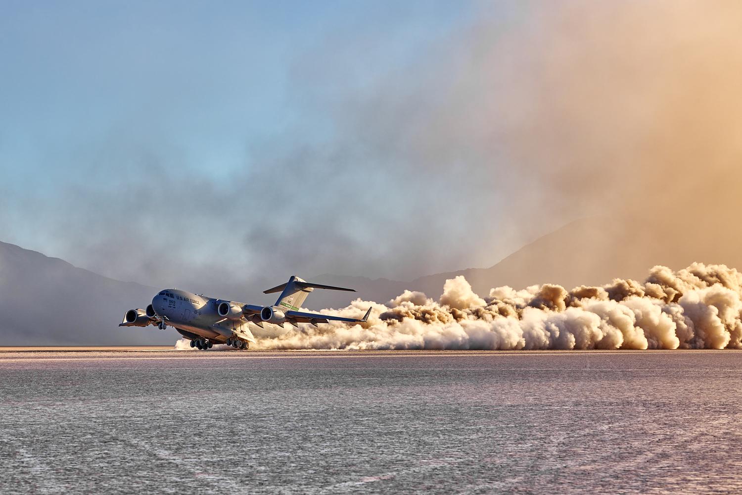 446th Airlift Wing C-17 takeoff on desert dry lake bed